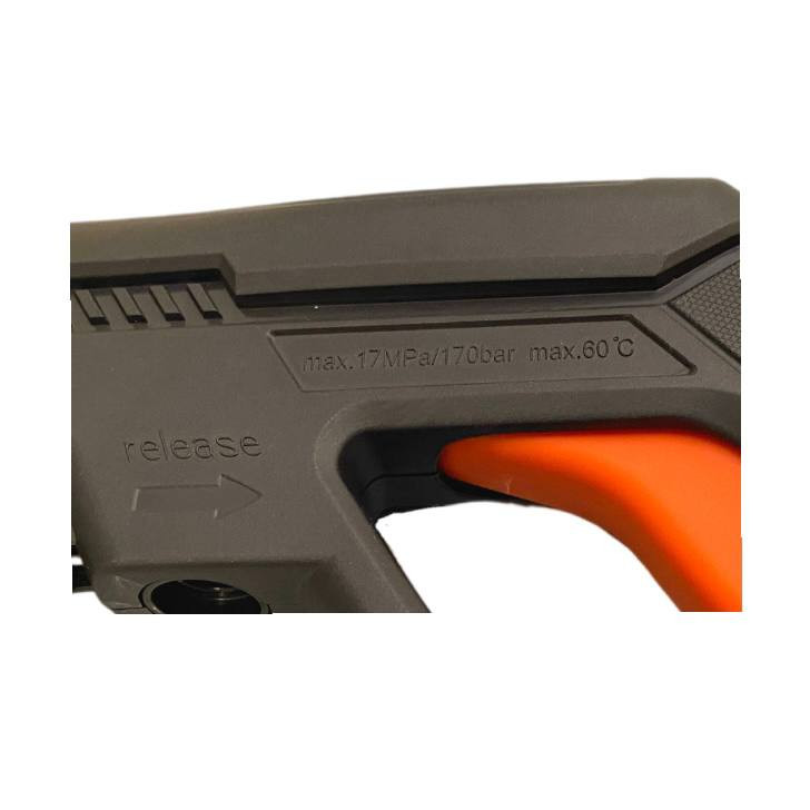 این مدل دسته کارواش دارای 170 بار واقعیست و بصورت فیک درج نگردیده و از بهترین متریال به زیبایی هر چه تمامتر ساخته شده و مدلهای مختلف آنرا توسط کالاچی لند وارد و به سراسر میهن عزیزمان پخش مینماییم. این نمونه لانس استثنایی دارای دو عدد نازل بلند میباشد یکی مدل متغیر از مه پاش تا تیز پاش و دیگری نازل 45 درجه بلند جهت شستن جاهاییکه دید و یا دسترسی شما کم است مانند زیر خودرو داخل گلگیرهای خودرو بالای پنجره ها و از شستن با آن لذت خواهید برد. قسمت داخلی گان از نوع فلزی ضد زنگ زدگی ساخته شده و دارای سیستم چرخش مسلسلی میباشد. قابل توضیح است سیستم مسلسلی زمانیکه شما در حال کار با کارواش هستین و دسته کارواش را بسمت مورد نظر میگیرید زاویه پخش آب مثلا افقیست و اگر بخواهید پخش آب را عمودی کنید بایستی دستتان را کج وراست میکردید ولی با این روش روی لوله ی دسته کارواش را چرخانده و جهت پاشش تغییر مینماید. از دگمه نارنجی بالای گان هم میتوانید سیستم چرخش را قفل فرمایید .دسته دارای قفل نازل بوده که در زیر دسته تعبیه گردیده است . خلاصه اگه بدنبال یک لانس و یا همان دسته کارواش حرفه ای میگردید این پیشنهاد ماست. بهمراه این لانس یک شلنگ 200 بار جنس درجه یک پلی اورتان نخ دار ضد سایش از جنس مرغوب به طول 5 متر میباشد. هنگام کار کردن با شلنگ و دسته کارواش دیگر نگران تاب خوردن شلنگ نیستید زیرا محل اتصال شلنگ به دسته فیتینگی میباشد و بصورت فشاری جا میرود.