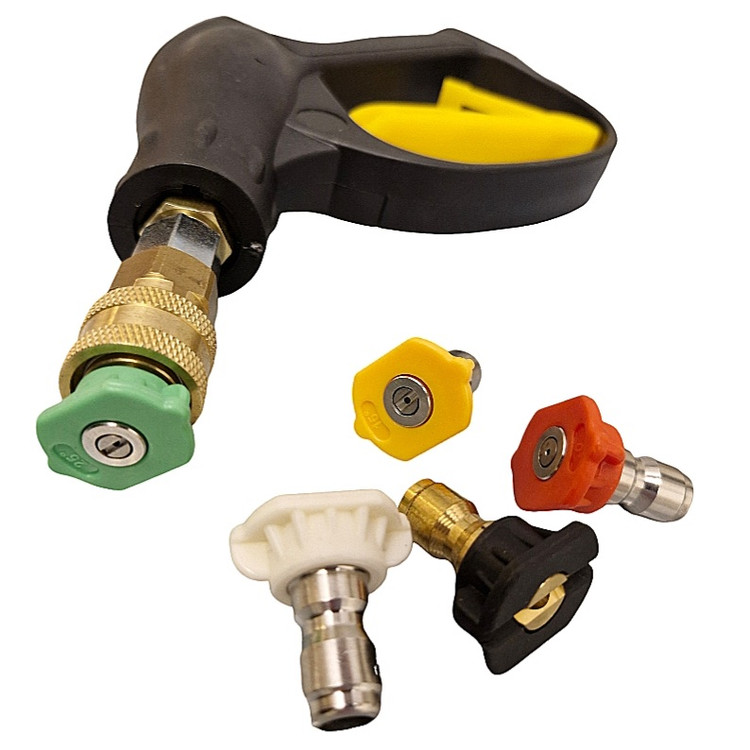 این دسته کارواش یا همان لنس و تفنگی ، دارای قطع کن بوده و دارای رزوه اتصال ۱/۴ میباشد که یک عدد تبدیل سایز ۸ آلمان نیز بهمراه این دسته تقدیم میگردد. این دسته مدل فیتینگی بوده و جنس کوپلینگ آن از نوع درجه یک جنس برنج اصلی سنگین میباشد. مدل پاشش این لنس همانطوریکه در عکسها مشخص است فیتینگی بوده که نشان دادن نازلهای رنگی صرفاََ به این دلیل است که خریدار متوجه شود مدل این نازلها سازگار با این لنس میباشد. که در ۴ سایز پاشش آب به رنگ قرمز و سبز و سفید و مشکی قابل استفاده میباشد. درصورت نیاز میتوانید هر کدام از این نازلها را جداگانه بصورت تکی یا ۴ عددی نیز خریداری فرمایید. این مدل لنس را با فومپاش نیز میتوانید ست بفرمایید و از پاشش فوم و کف واقعی لذت ببرید فقط یک عدد نازل سبز بهمراه لنس تقدیم خریدار خواهد شد